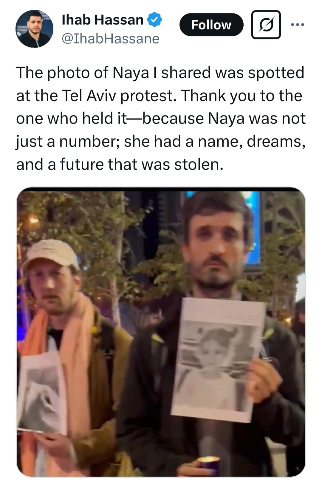 ציוץ של איהב חסן, שהעלה לרשת את הצילום של נאיה, וזיהה אותו בפעולה שלנו