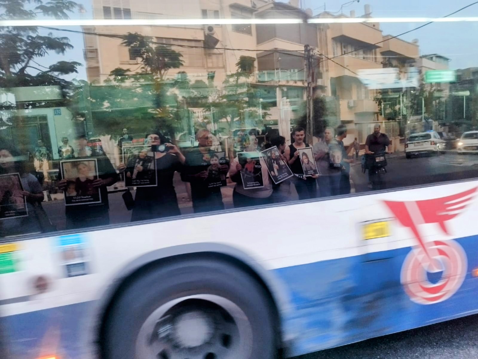 26.5.25, משמרת יפו לזכר הילדים בעזה. השתקפות על אוטובוס בכיכר חג' כחיל, יפו